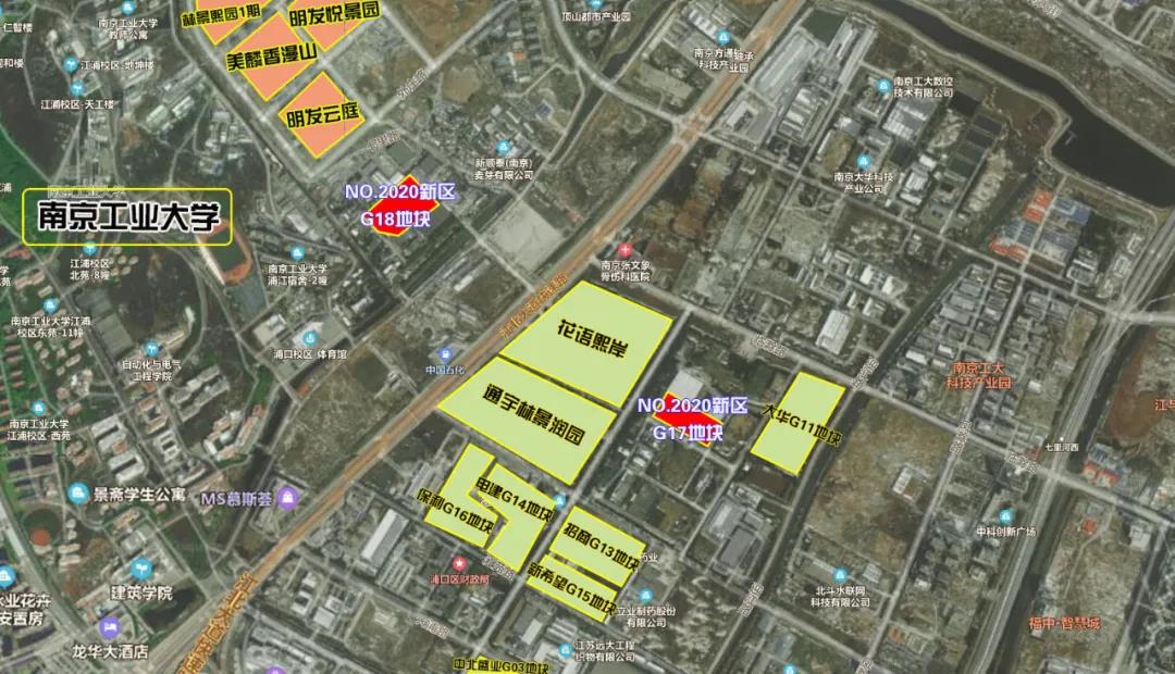 G17地块位于江北大道快速路以东,周边住宅项目众多,有花语熙岸、通宇林景润园、大华G11、以及9月底刚出让的四幅地块;G18地块位于江北大道快速路以西,位于南工大周边,附近有的住宅项目为明发云庭、美麟香漫山、明发悦景园、通宇林景熙园1期、二期等。