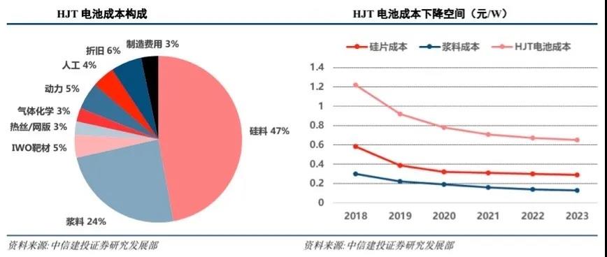 HJT电池的光电转换率高于PERC电池,且衰减率更低,其劣势在于成本偏高。今年以来,HJT电池的各项成本已大幅下降,尤其是在设备投资方面。