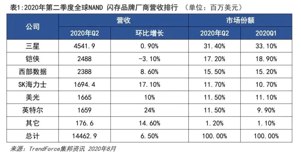 不过,虽然英特尔的存储芯片业务逐渐沦为其非核心业务,但其停掉的也只是DRAM内存业务,而在NAND闪存业务上,英特尔则一直保持着不错的市场份额。简单来说,如今韩国的三星牢牢占据NAND市场的领先地位,DK海力士排名第四,英特尔则排在第五的位置。