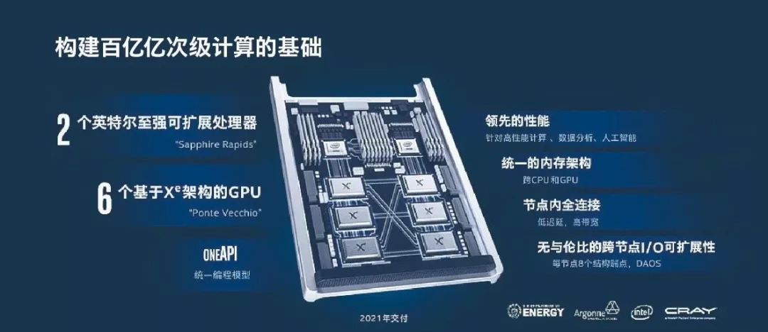 除了守住原有优势,英特尔也在进军英伟达的地盘——独立显卡GPU,为下一代至强CPU搭配六路Xe架构GPU显卡,实现百亿亿次计算,并计划2021年投入美国的下一代超级计算机“极光”(Aurora)当中。