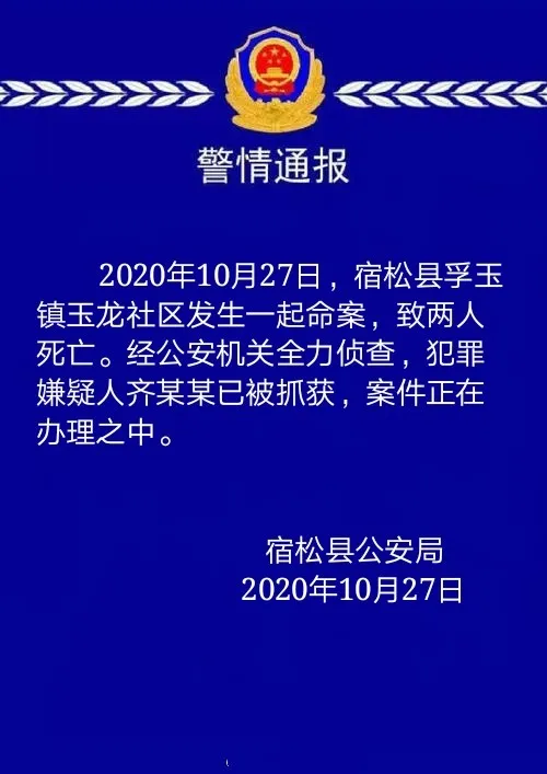 据安徽宿松县公安局通报,10月27日,宿松县孚玉镇玉龙社区发生一起命案,致两人死亡。经公安机关全力侦查,犯罪嫌疑人齐某某已被抓获,案件正在办理之中。