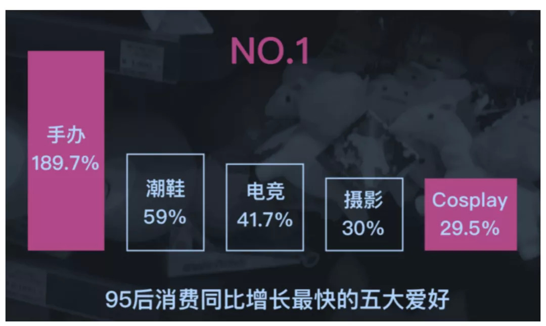 报告显示,Z世代月均可支配收入是3501元,是全国居民月均可支配收入的1.5倍。而另一份报告显示,95后消费同比增长最快的五大爱好,分别是手办(189.7%),潮鞋(59%),电竞(41.7%),摄影(30%)和Cosplay(29.5%)。