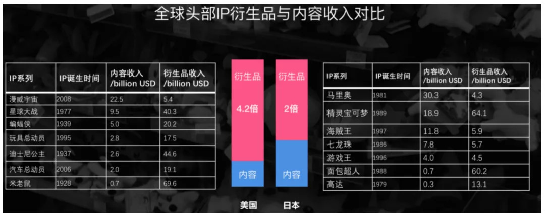 王欣磊以日本、美国市场的头部IP为例做了说明。“在日本,头部IP来自衍生品的收入约是内容的2倍。美国更高,大约在4.5倍。比如,‘米老鼠’来自内容的收入是7亿美元,但衍生品收入却高达696亿美元;‘玩具总动员’内容收入28亿美元,衍生品收入175亿美元;‘面包超人’内容收入7亿美元,衍生品收入602亿美元……”