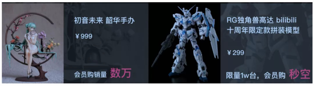他举了两个B站会员购的衍生品销售案例,以支撑这个观点。2020年,单款售价999元的初音未来韶华手办在B站会员购开售,销量达到了数万件;限量1万台,单款售价299元的RG独角兽高达B站十周年限定款拼装模型,在B站会员购1秒售空。