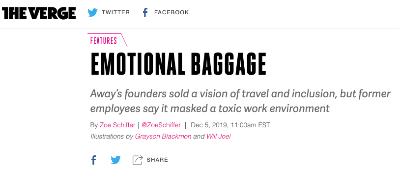 去年12月,网红行李箱品牌Away被The Verge长文爆料内部企业文化有毒,并点名批评其联合创始人兼前CEO Steph Korey。Korey在当月就辞去了Away的CEO职务,前Lululemon高管Stuart Haselden接管CEO一职。