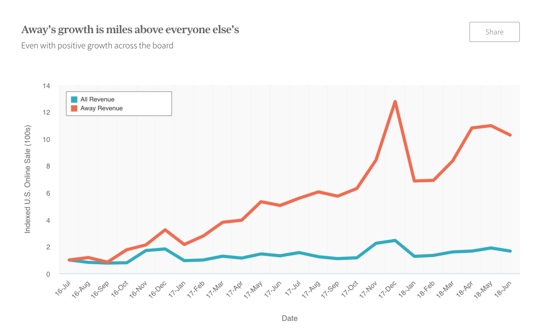 今年6月,Away以低于此前14.5亿美元的估值完成3000多万美元新一轮融资。