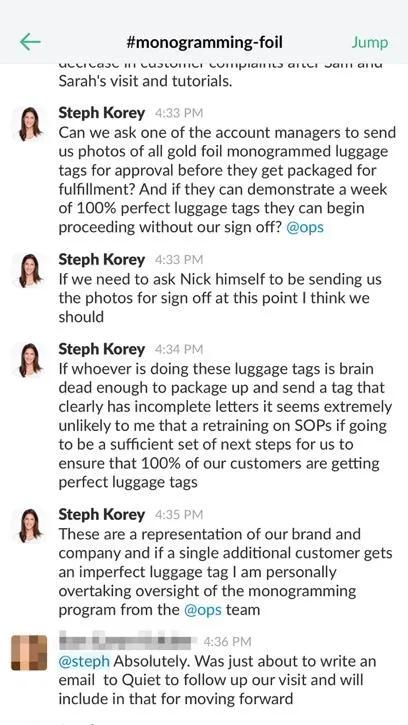 而这些“公共频道”却成为了老板们无情批评下属的表演场,在一次行李箱邮寄失误事件中,Korey直接公开在群聊里把犯错的员工叫“愚蠢至极(brain-dead)”,这种恐吓员工和监视的风气已经让所有人都提心吊胆。