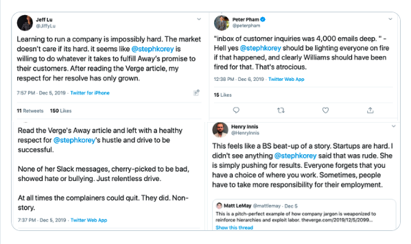 在这样的压力下创始人们似乎有着心照不宣的共识,认为只要能成功,做什么都不过分,而此次Away事件中让人吃惊的是,许多创始人在Twitter上公开表示对Korey的支持,认为她“根本没做错什么”,不禁让人怀疑这一场关于成功和人性人情的博弈,我们的底线到底在哪里?