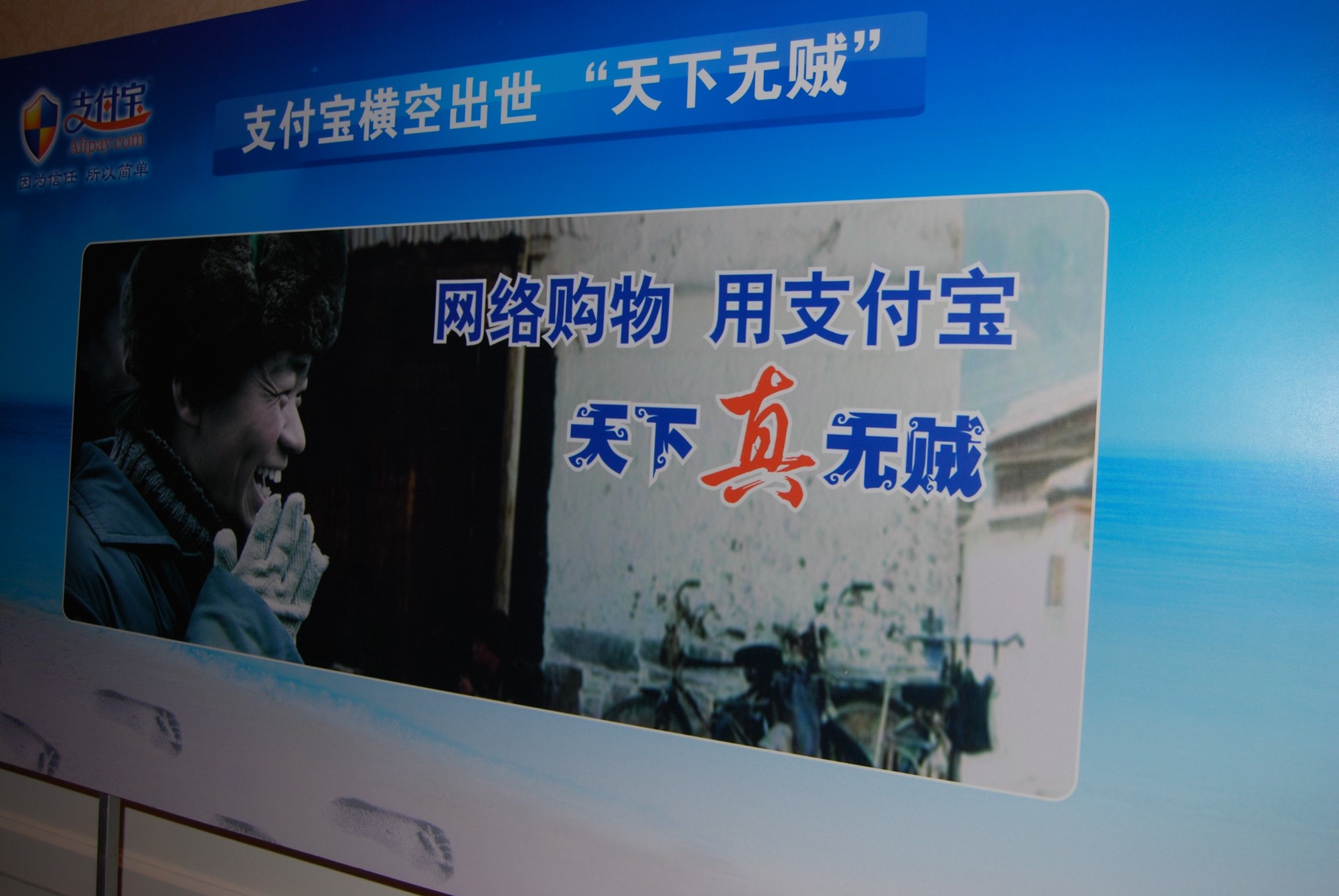 支付宝告别孤军奋战差不多是在2005年,那一年被称为“电子支付元年”。当年,支付宝找了贺岁大片《天下无贼》的原班人马拍了一组广告。王宝强扮演的“傻根”一脸诚恳地告诉工友,“用支付宝,没贼!”跟随这则广告走红的是一句承诺:“你敢付,我敢赔”。