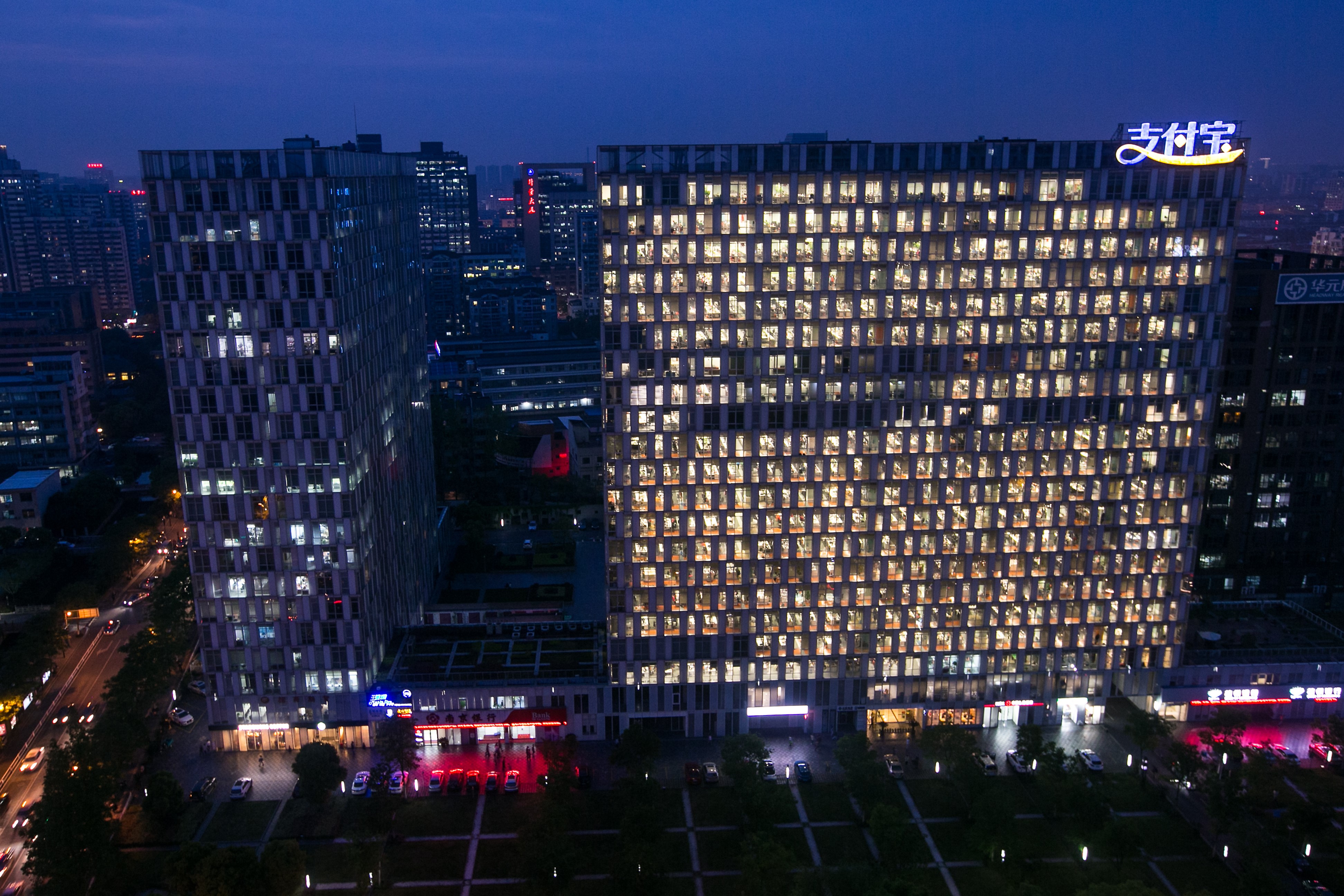这是当时杭州最高端的写字楼之一,外立面采用彩釉玻璃,面朝杭州主干道天目山路,在阳光的照耀下熠熠生辉,楼顶的“支付宝”三个大字也让它有了支付宝大楼的名号。