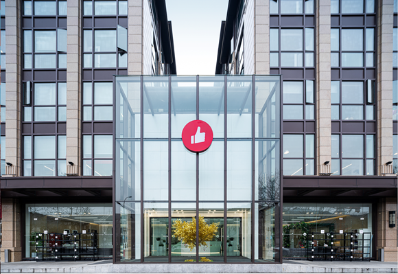 另一家跟随蚂蚁脚步到来的公司位于西溪路698号,路过的车辆远远就能看到他们的办公大楼,外立面上有个大拇指,给来往车辆“点赞”。去年,他们从黄龙万科中心搬到这里,很快把周边的线下商户发展成为自己的用户,点赞的标签随处可见。