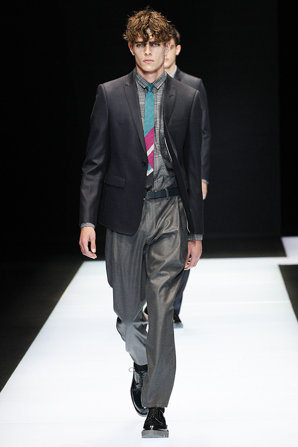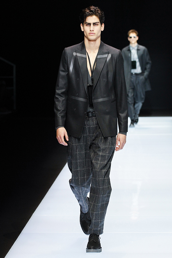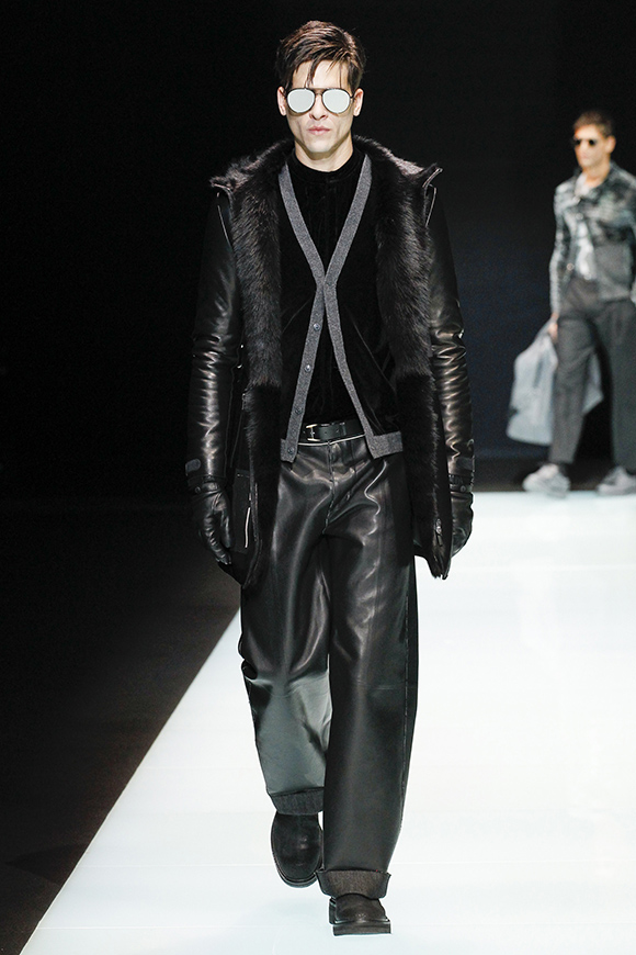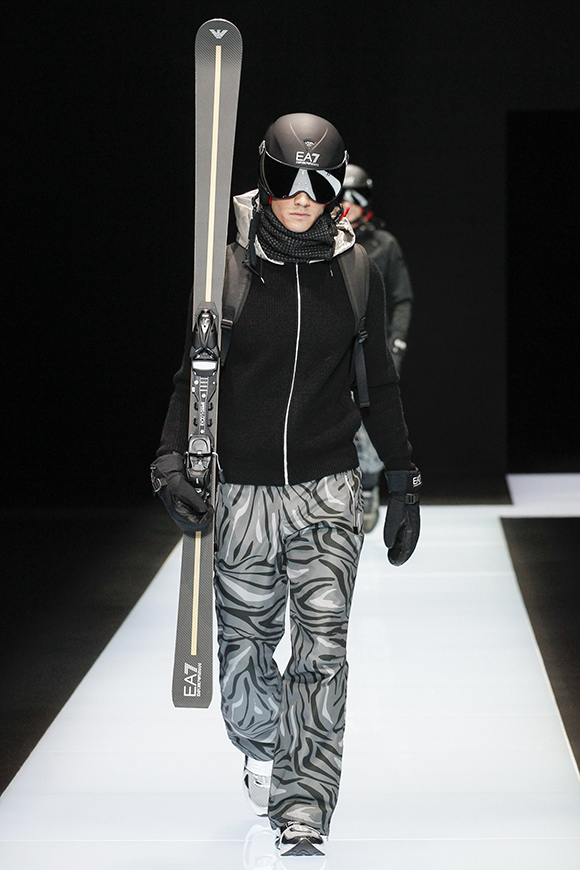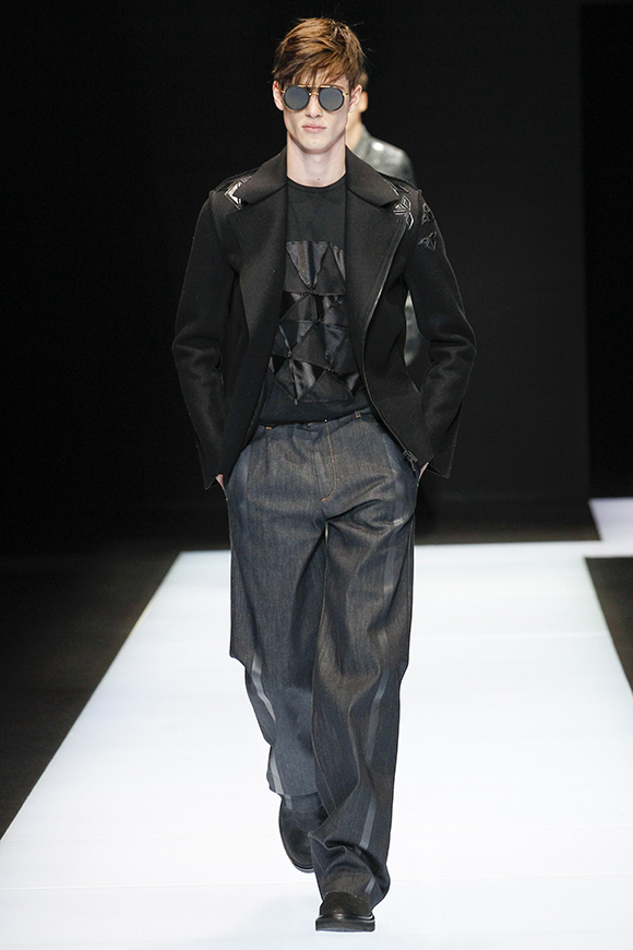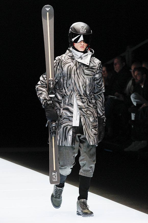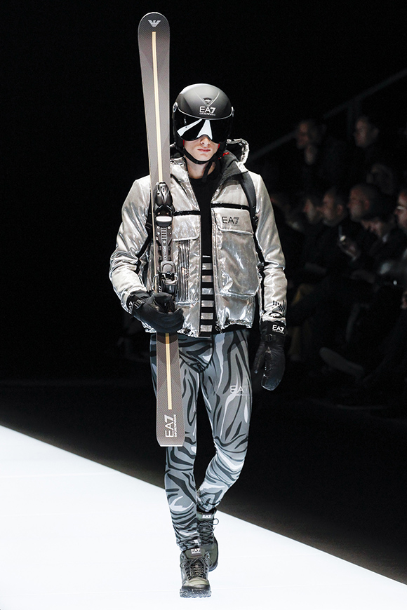 以闪亮滑雪服开场的 Armani 副线 Emporio Armani 自然没有输给年龄的期望值。除了以平流层空间为由头的滑雪服开场以外,未来感也体现在了配饰的方方面面。轻便嵌入式鞋底的圆头鞋,科技面料的手提袋以及木纹印花的小牛皮镶边,都在用细节来验证年轻的陌生感。丹宁成为本季面料的主力,Armani 牛仔裤用了多层次的线条装饰,很有新意。