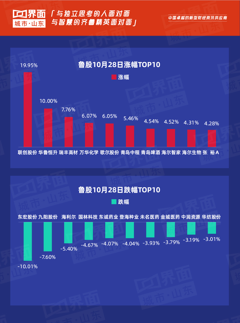 10月28日,山东省内沪深股票有109只个股上涨,105只个股下跌;总市值过千亿的有万华化学(600309)、海尔智家(600690)、歌尔股份(002241)、潍柴动力(000338)、青岛啤酒(600600)、山东黄金(600547)共6家,500亿-1000亿的共有3家,分别是中泰证券(600918)、中航沈飞(600760)、华熙生物(688363)。