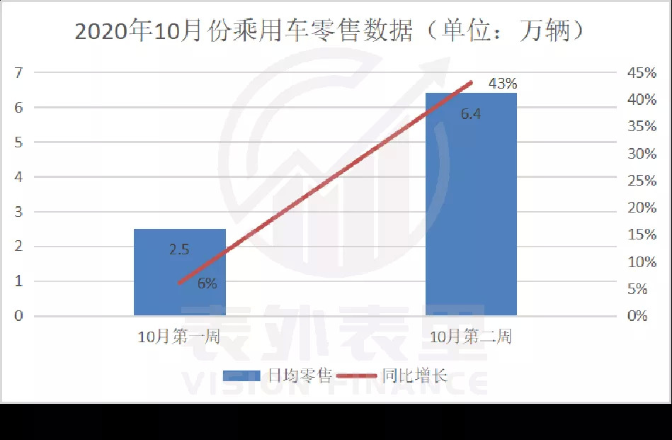 结合10月份乘用车的零售数据,10月第一周,乘用车日均零售2.5万辆,同比增长6%,零售表现平稳。10月第二周的日均零售是6.4万辆,同比增长43%,环比9月同期销量增长50%,表现较强。