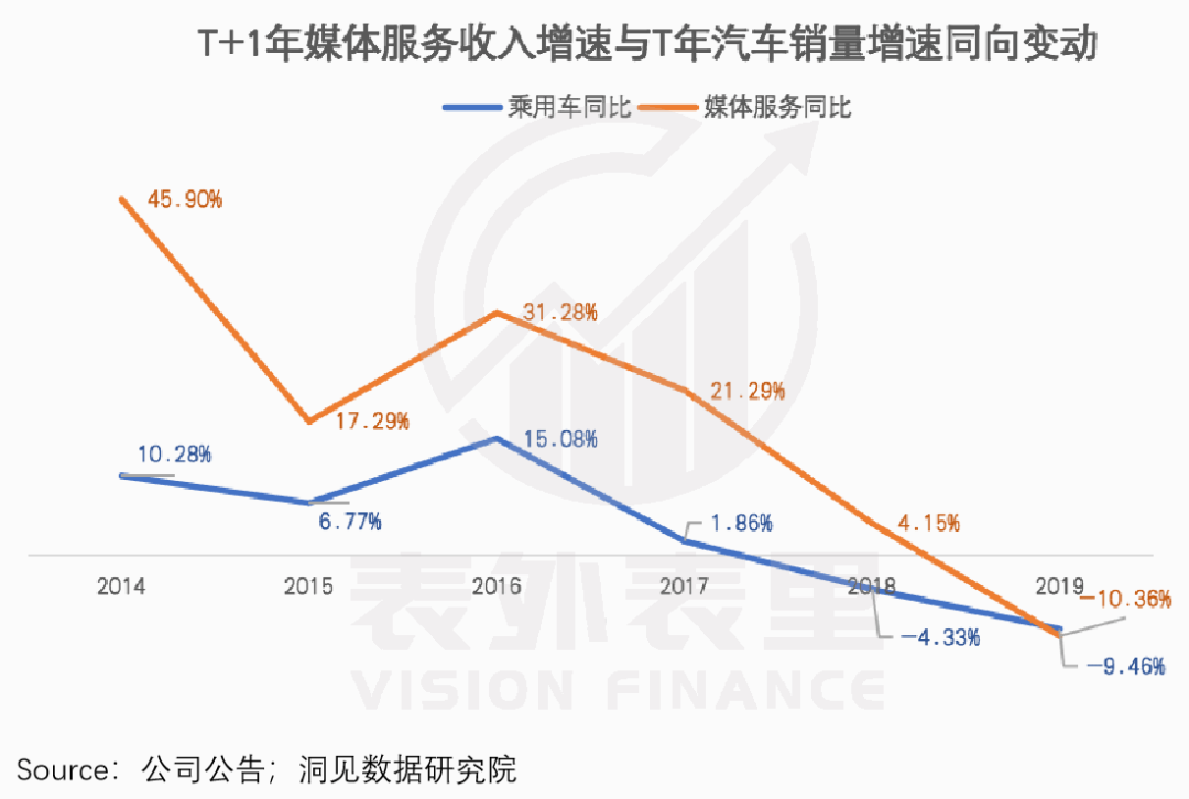 注释:媒体服务收入增速取值的实际年份比汽车销量增速晚一年,之所以放在同一年标尺下比对是为了表现两者之间的关联性。
