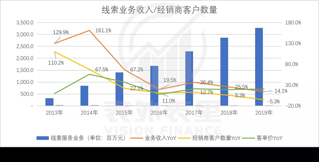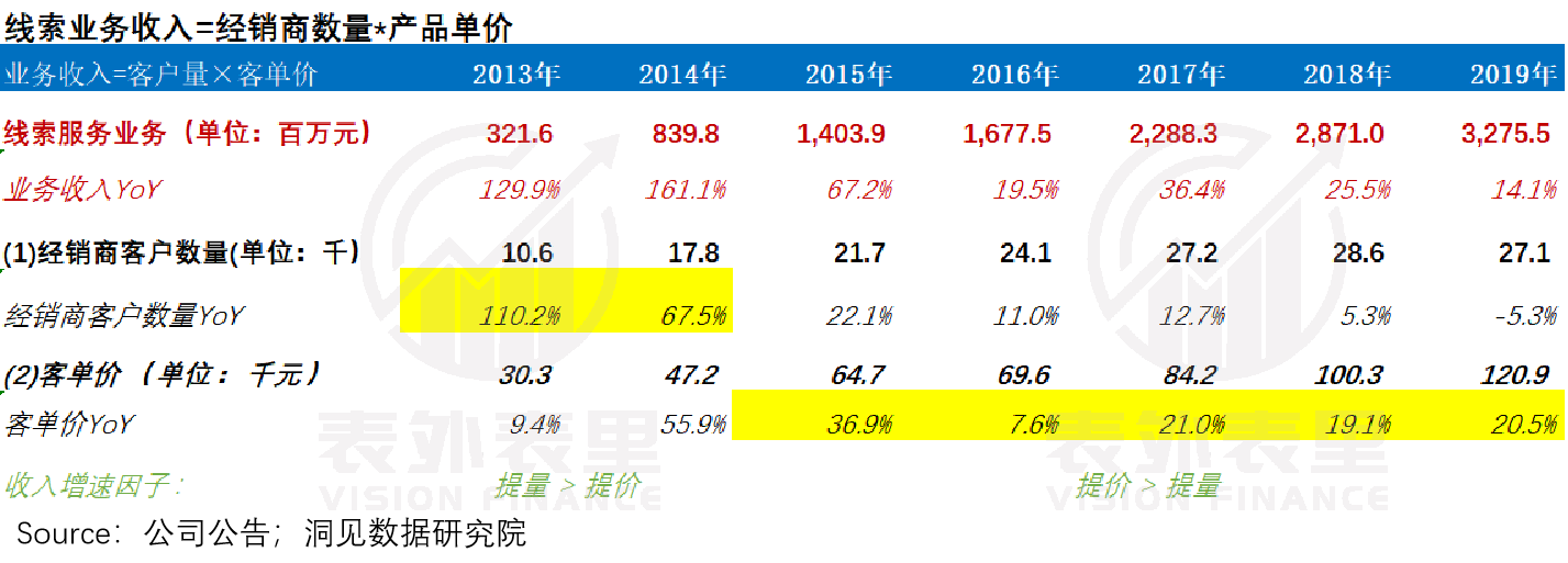 ①在2013-2014年阶段,潜在线索生成业务收入的增长因素主要来自于经销商客户数量的大幅上升——该阶段经销商客户数量的同比增长率,高于客单价的同比增长率。