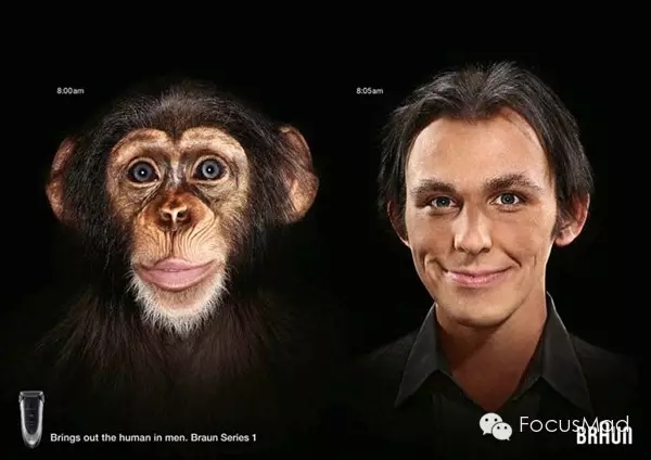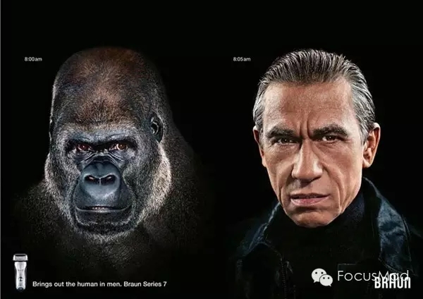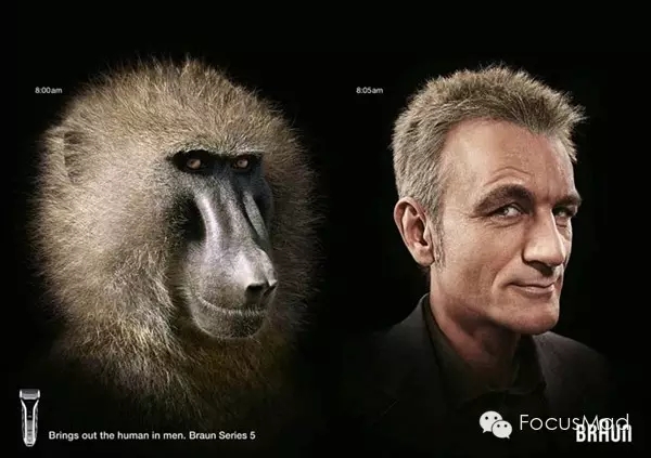 看来博朗真会玩,上期在夸张创意手法上已经展现其作品,而它在对比创意也不放过,猴子、金刚、狒狒全部搬上来。细心地你会发现画面上剃须前后注明的时间分别为早上8:00和8:05,产品不仅效果好、最重要的是节省时间。