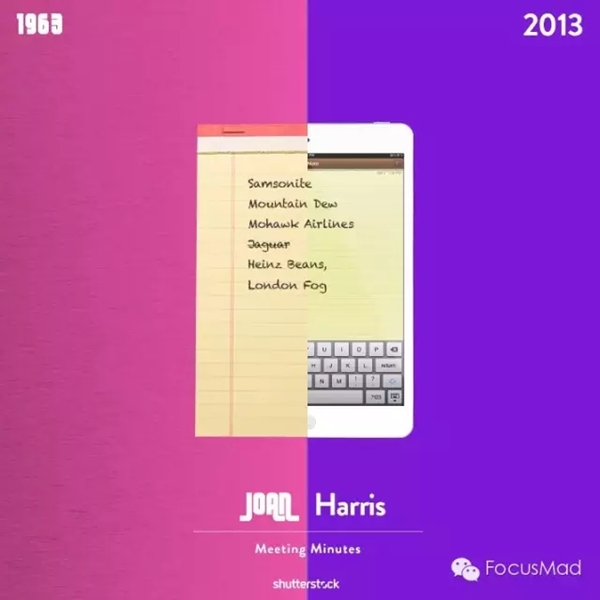 比如,剧中Donald的公文包变成了现代化的云存储,秘书Peggy Olson的打字机和现代化的MacBook Pro连接在一起,Joan的记事本变成iPad等等。