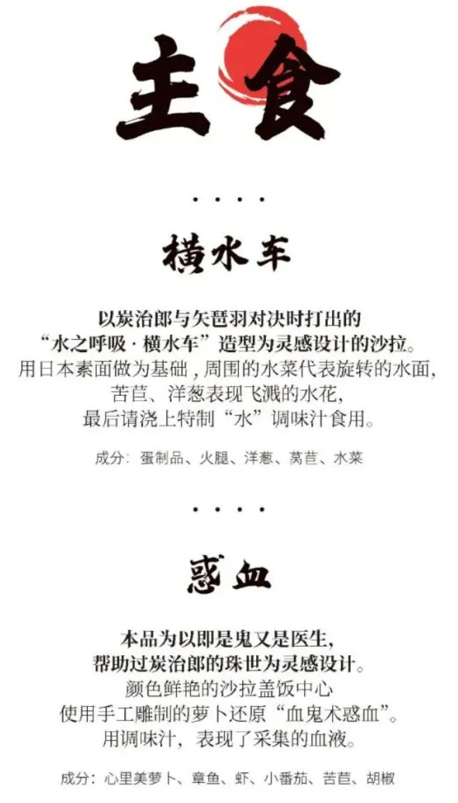 比如ufotable Cafe上海店于10月3日开始推出的《鬼灭之刃》主题店,就从店铺装修风格,到同步上线的菜品、饮品,再到店内现场贩售的衍生品,都与ufotable(飞碟社)制作的《鬼灭之刃》动画内容息息相关。