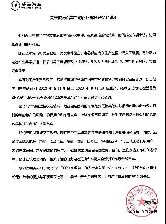 昨日下午14点,威马发出声明,决定召回召回2020年6月8日至2020年9月23日生产的1282辆电芯型号为ZNP3914895A-75A的车型。声明中称由于电芯供应商在生产过程中混入了杂质,导致动力电池产生异常析锂,极端情况下可能导致电芯短路引发起火风险。