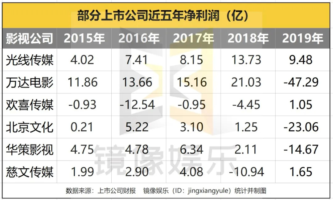 在镜像娱乐统计的几家影视公司中,除了光线传媒、万达电影两家净利润相对稳定外,北京文化即便在2017年参与了《战狼2》《芳华》两部高票房影片,净利润也只达到3.1亿,且公司尚未拿出3年净利润超15亿的成绩。儒意影业面临的对赌难度可想而知。