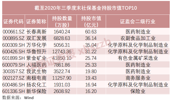 从个股情况看,截至三季度末,社保基金持股市值最高的是长春高新,合计持有1640.24万股,总市值60.63亿元;持股市值排名第二的是双汇发展,社保基金合计持有36.14亿元市值的股份;万华化学紧随其后,社保基金合计持有公司5056.31万股股份,总市值合计35.04亿元。