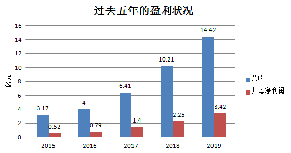 如果把时间拉长来看,过去五年艾迪精密都保持在高速发展阶段,各项财务指标均呈现上升的态势。2015年-2019年,公司营业收入从 3.17亿元增长至14.42亿元,年复合增速达到46.04%,归母净利润从0.52亿元增长至3.42亿元,年复合增速达到60.14%,2019年营收和净利润增速分别达到41.33%和51.96%。随着盈利能力的提升,艾迪精密的净资产收益率从2015年的 12.09%增长至2019年的29.52%,翻了一倍还多,这一水平在目前A股的上市公司中绝对属于第一梯队。
