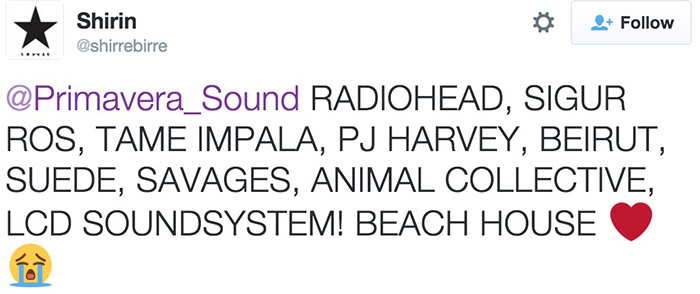 巴塞罗那春声音乐节昨天公布了今年的演出阵容,阵容之强大导致乐迷们看到lineup的瞬间纷纷嗷的一嗓子昏了古七。