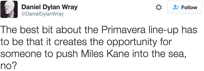 还有乐迷死都忘不了攻击下个别音乐人:“春声音乐节阵容最棒的地方,就是我终于找到了把Miles Kane这个小婊砸推下海的机会。”