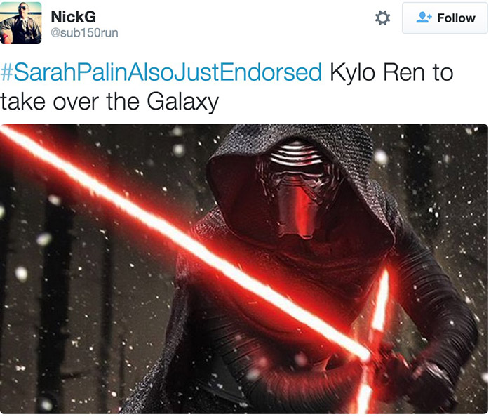 星战粉丝表示:“支持川普算什么,佩林还支持Kylo Ren统治银河系。”