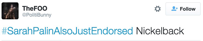 而乐迷们是不会放过任何一个黑Nickelback的机会的:“支持川普算什么,我会告诉你佩林最喜欢的乐队是Nickelback吗?”