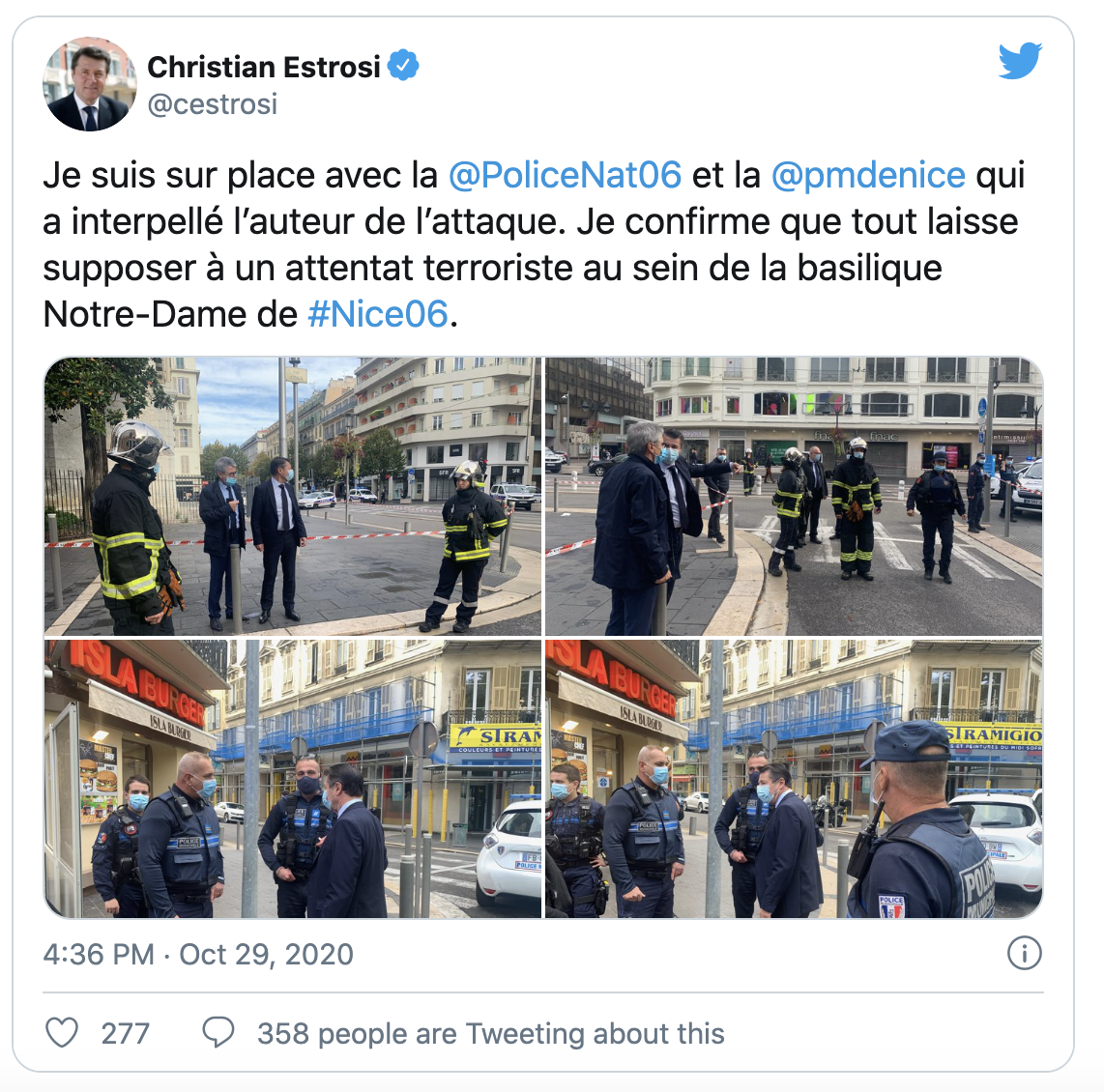 尼斯市长克里斯蒂安·埃斯特罗西已抵达袭击现场。他表示,执法部门已封锁现场,嫌疑人被拘留,一切迹象表明,持刀袭击是恐怖主义行为。警方随后确认,袭击已造成2人死亡,多人受伤,嫌犯已被拘捕。