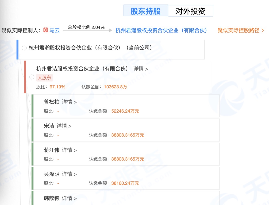 先来看杭州君瀚背后的股东:天眼查信息显示,杭州君洁持有杭州君瀚97%的股份,且在杭州君洁股东中,曾松柏(现任蚂蚁集团首席人才官)和韩歆毅(蚂蚁集团副总裁,负责财务、融资事务)持股最多,为13.59%;剩下的股东包括马云(阿里巴巴创始人)、谢世煌(阿里巴巴联合创始人)、井贤栋( 蚂蚁集团执行董事长)等。