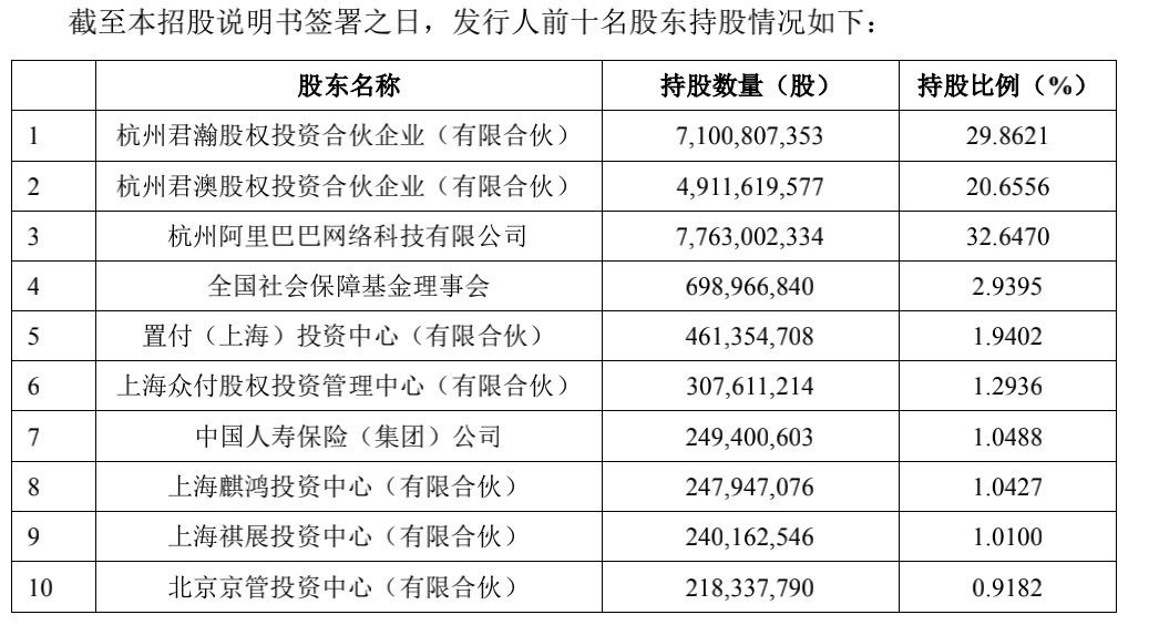 此外,阿里巴巴持股为96.52亿股,稀释为31.77%,而外部股东中,全国社保为最大机构投资者,持股2.3%。