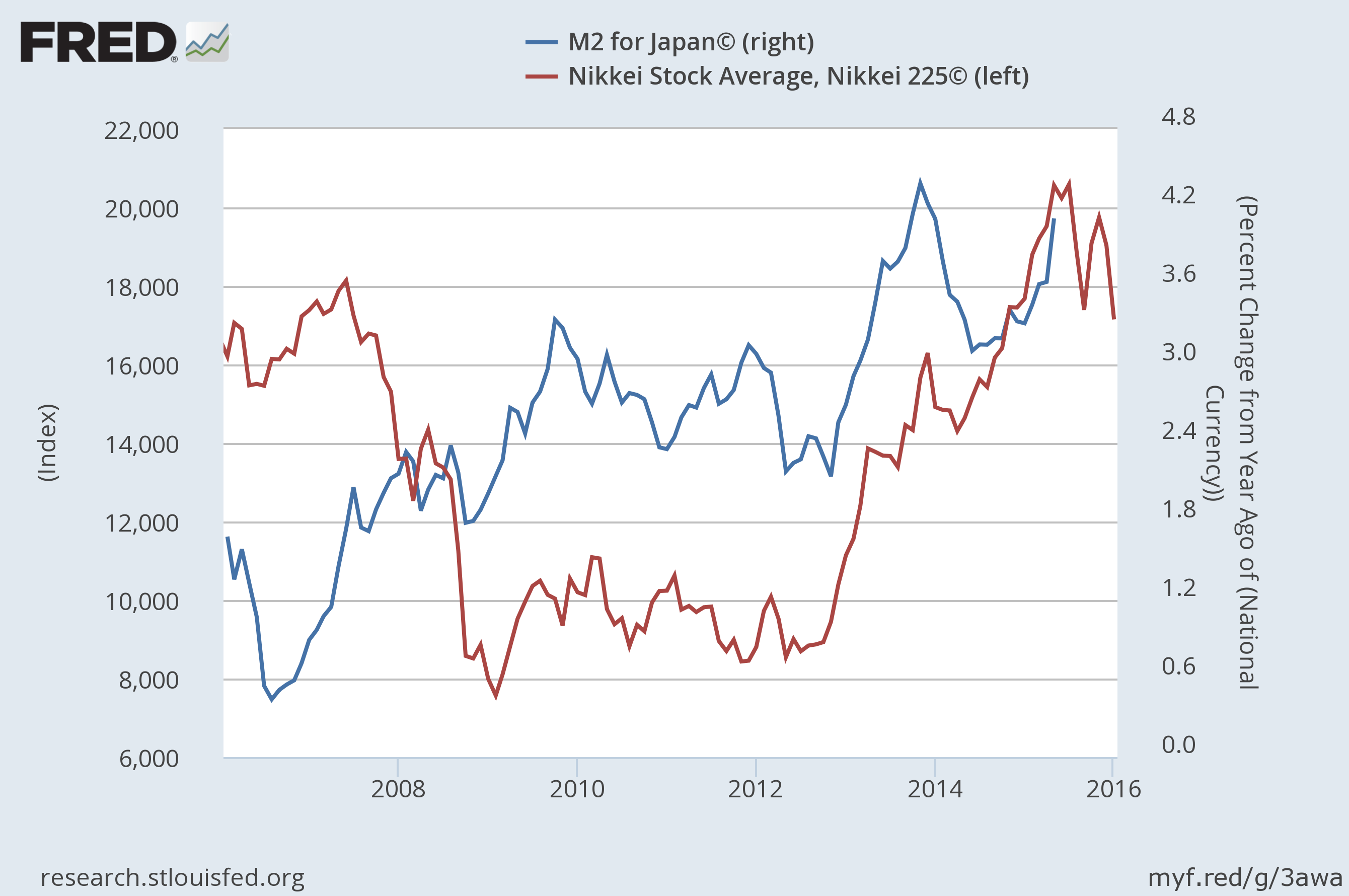 图一,日本M2同比增速与日经指数叠加图,数据来源:美联储