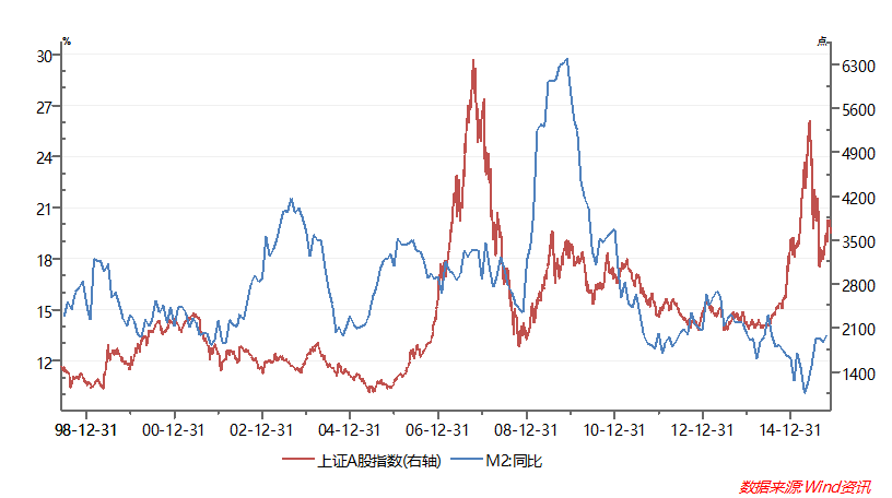 图二,中国M2同比增速和上证综指叠加图,数据来源:WIND资讯