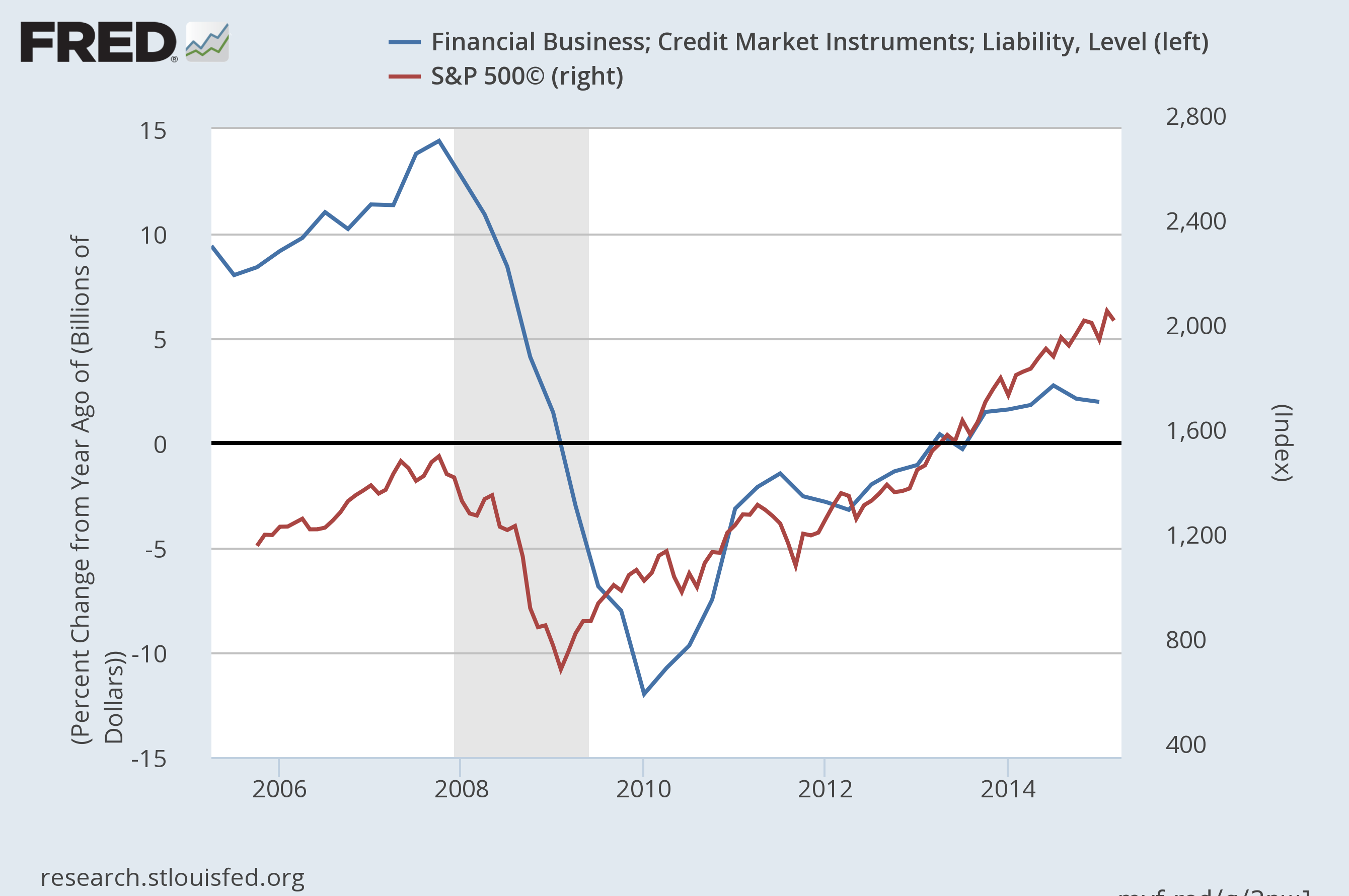 图4,美国“Financial Business; Credit Market Instruments; Liability, Level”同比增速与S&P 500指数叠加图,数据来源:美联储