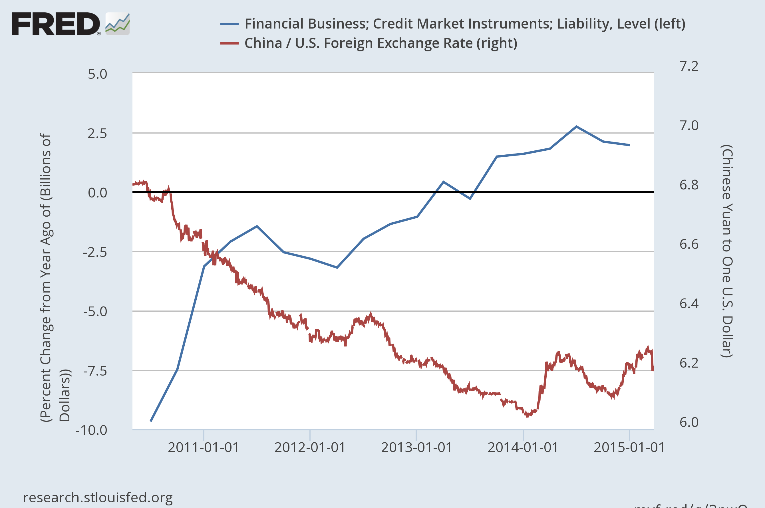 图5,人民币汇率(兑1美元)与美国“Financial Business; Credit Market Instruments; Liability, Level”同比增速叠加图,数据来源:美联储