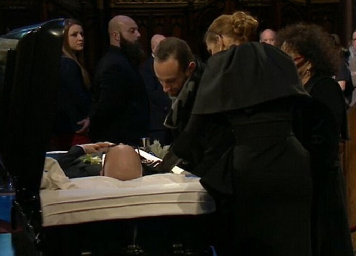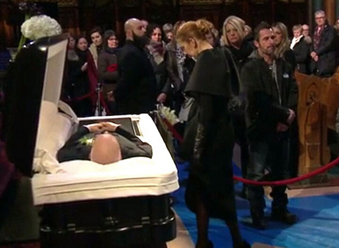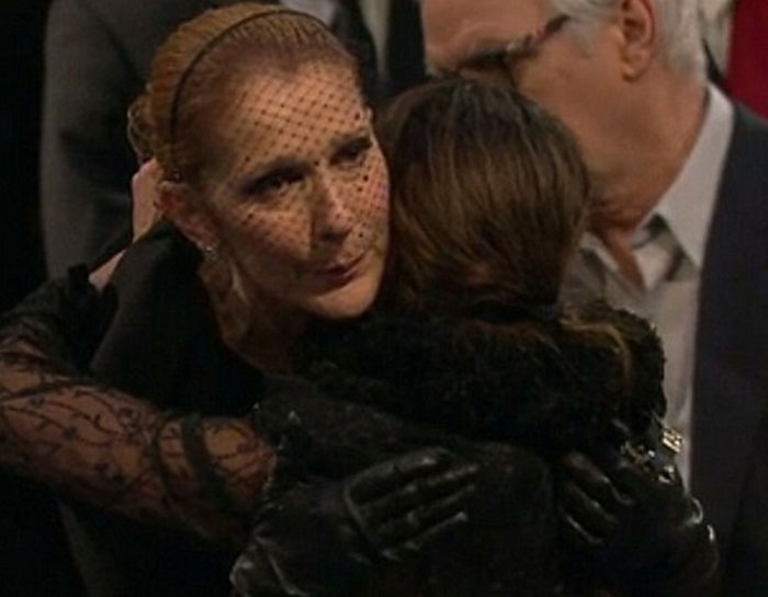 雷尼的双手交叉在一起,身穿黑西装和白衬衫,系着一条白色的领带。在靠近丈夫遗体边的心碎时刻,席琳·迪翁将自己的左手搭在丈夫的肩上,几次无法抑制住夺眶而出的泪水,只能用一条白色的手帕擦拭泪水。