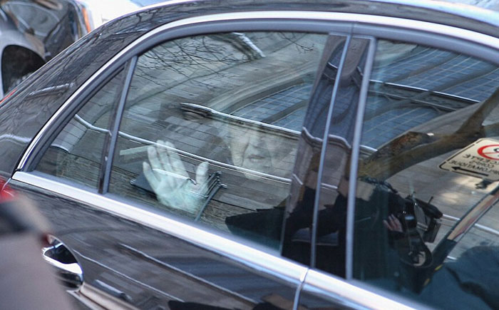 这位面容姣好的美女的妆容一丝不苟,在粉丝们向她挥手致意,时而送出亲吻时,她也与粉丝们礼貌地打着招呼。在她身边的是她的长子安杰利-雷尼·查尔斯,他身穿着黑色的西装,系着颜色相同的领带。