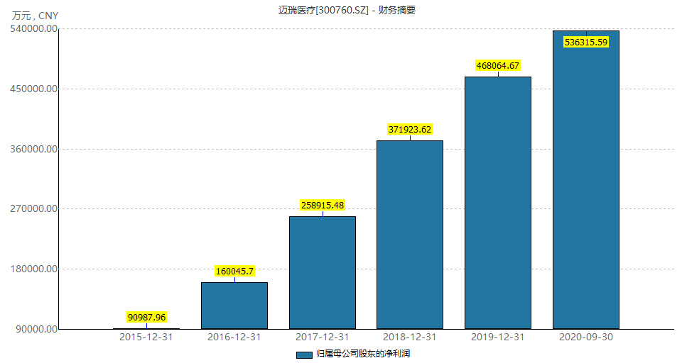 公告显示,迈瑞医疗在2020年前三季度实现营业收入160.64亿元,同比增长29.76%;实现归属于上市公司股东的净利润53.63亿元,同比增长46.09%。
