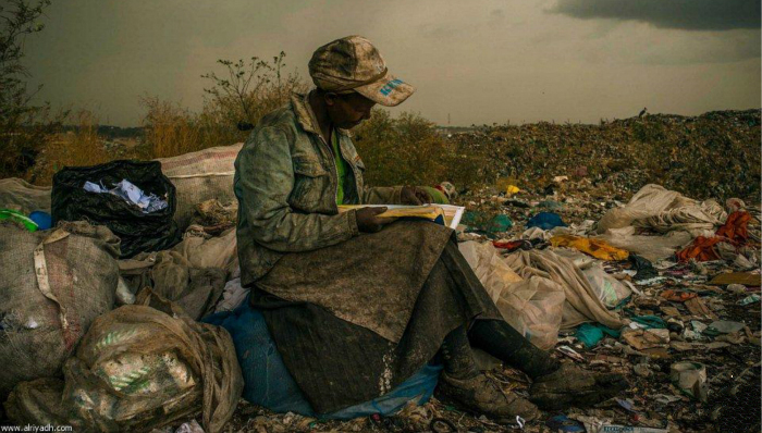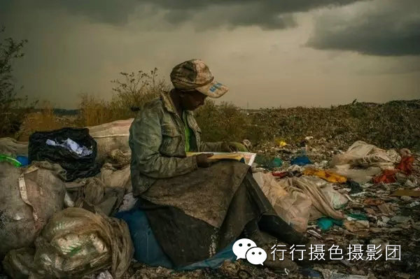 一名妇女在捡垃圾的间隙看书。