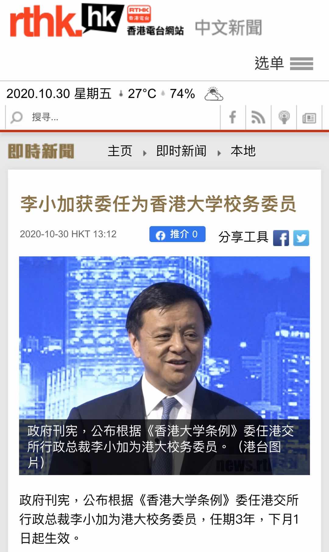 据香港电台网站、东网10月30日消息,港府今日引用《香港大学条例》刊宪,委任港交所行政总裁李小加为港大校务委员,任期3年,11月1日起生效。此前,9月29日,据港交所消息,兹提述香港交易及结算所有限公司(香港交易所)于2020年5月7日刊发的公告,有关李小加拟于其现时合约在2021年10月届满后不再寻求续任香港交易所集团行政总裁。