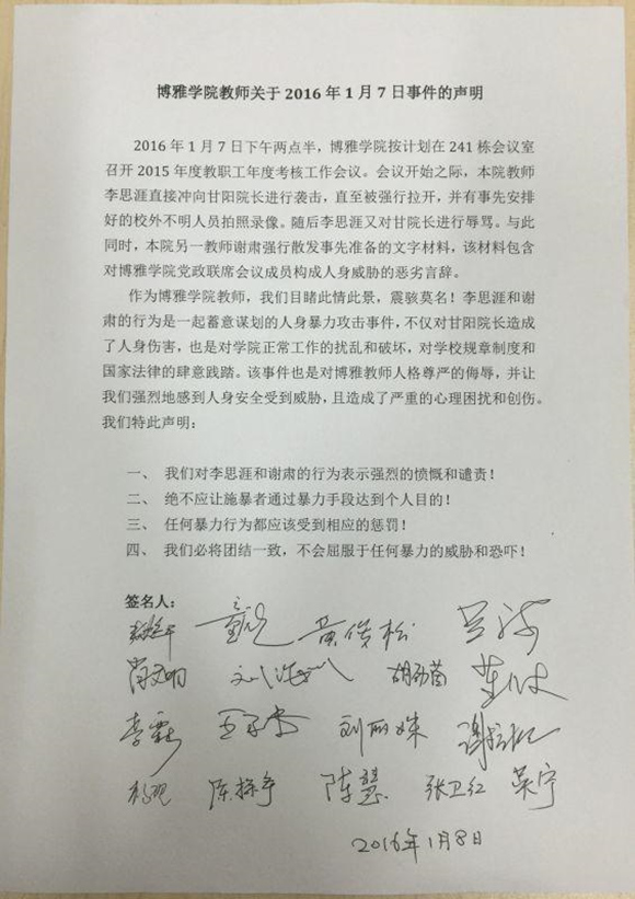 (一封《博雅学院教师关于2016年1月7日事件的声明》的公开信在网上流传,公开信描述了上述事件经过,并谴责了青年教师李思涯的暴力行为,图片来源:网络)