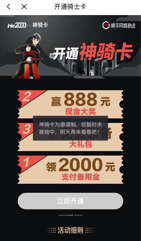 今年下半年微众银行与顺丰合作推出“神骑卡”, 主要面向顺丰骑手,为骑手提供2000元支付备用金。