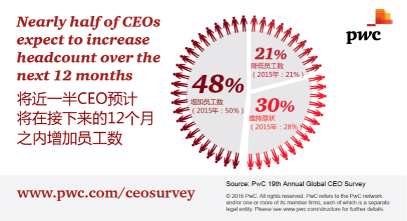 调研数据显示,48%的CEO计划在未来12个月增加员工人数。企业招聘活动最活跃的国家分别为印度(70%)、英国(66%)和中国(57%)。