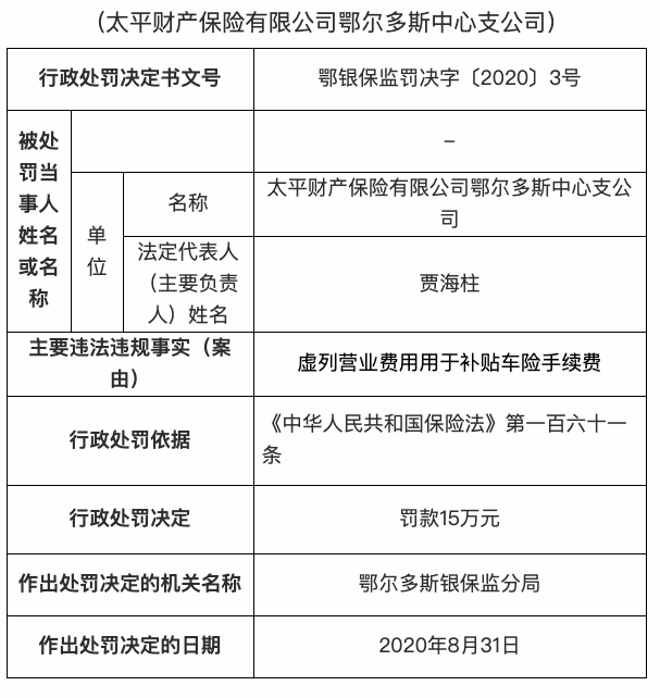 30日,鄂尔多斯银保监分局公布行政处罚信息公开显示,太平财产保险有限公司鄂尔多斯中心支公司因虚列营业费用用于补贴车险手续费,被处罚款15万元。邬鹏为太平财产保险有限公司鄂尔多斯中心支公司虚列营业费用用于补贴车险手续费的违规行为直接责任人,受到警告处分,并被罚3万元。