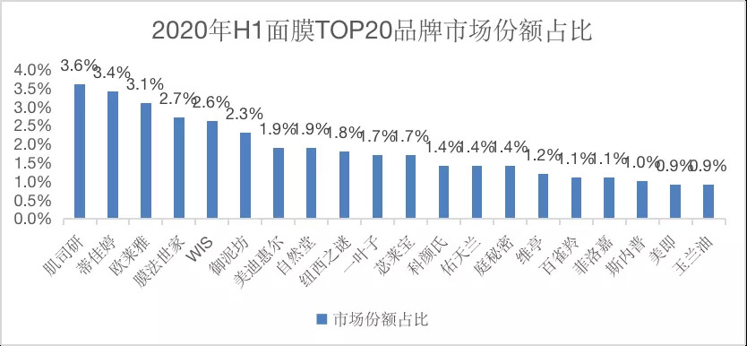 据欧特欧数据显示,2020年上半年,TOP20的面膜品牌占据市场37.1%的份额,品牌集中度较低,市场较为分散,竞争激烈。其中,肌司研以3.6%的市场占比位列第一,仅比排名第二的蒂佳婷多0.2个pct。此外,在渠道的品牌排名中,肌司研以1.9%的渠道零售额占比排名天猫渠道的第9位;以9.1%的道零售额占比排名京东渠道的第1位。