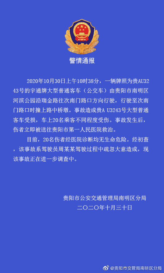 据@贵阳市交管局南明区分局 微博消息,2020年10月30日上午10时38分,一辆牌照为贵AU3243号的宇通牌大型普通客车(公交车)由贵阳市南明区河滨公园沿瑞金路往次南门路口方向行驶,行驶至次南门路口时撞上路中桥墩。事故造成贵A U3243号大型普通客车受损,车上20名乘客不同程度受伤。事故发生后,伤者立即被送往贵阳市第一人民医院救治。