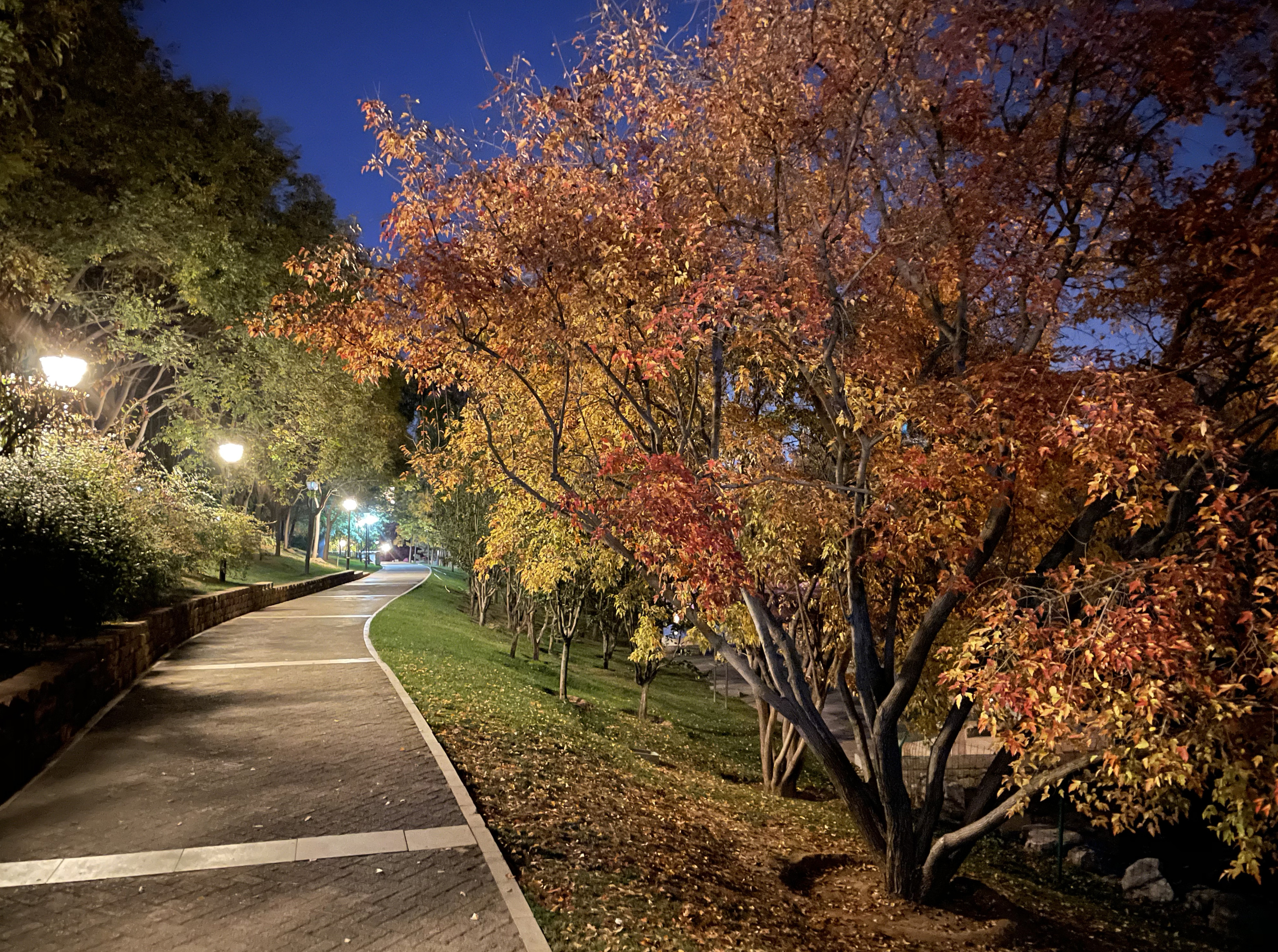 晚十点的公园,开启夜间模式,基于iPhone 12 Pro大光圈广角镜头进光量的提升以及激光雷达镜头提升自动对焦的速度,使得图中高光压制和噪点控制表现的不错,并且没有整体涂抹感,暗部细节表现也更丰富。